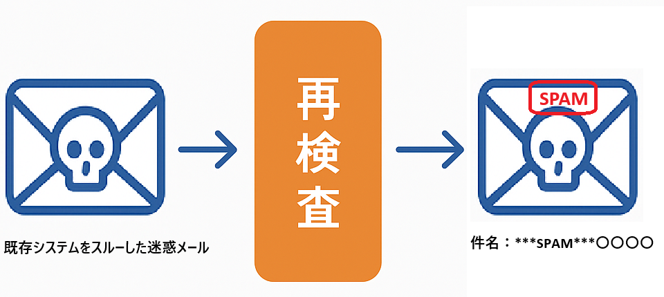 既存のシステムでは、迷惑メールと判定されたメールは受信前に拒否される仕組みとなっておりますが、今回新たに導入した再検出機能では、すり抜けた迷惑メールについて件名に「***SPAM***」を付与し、受信者に配送されるようになっております。