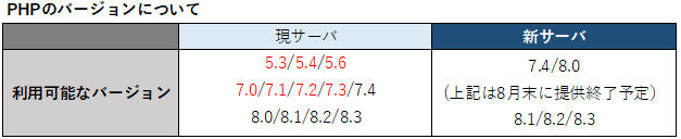 • 新サーバへの移行時、PHP7.4/8.0は一時的に利用可能ですが、2024年8月末日に提供を終了する予定です。