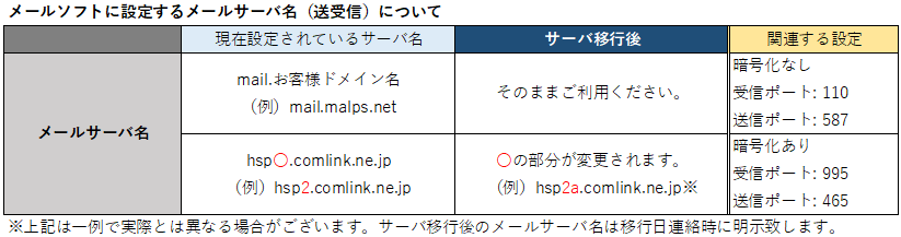 • メールソフトに指定するメールサーバ名(送受信)が、hsp.comlink.ne.jpになっている場合は、の部分が変更されます。移行日になりましたらサーバ名を変更してご利用ください。