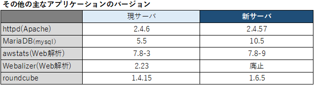 • 新サーバではメーリングリストがサポート外となり利用できません。メーリングリストをご利用のお客様は新サーバではなく1つ前のOSを採用している既存のサーバに移行して頂くかたちとなります。(メールアドレスリストは引き継がれますが詳細設定は初期化されます。管理者パスワードを含め再設定が必要となります。)